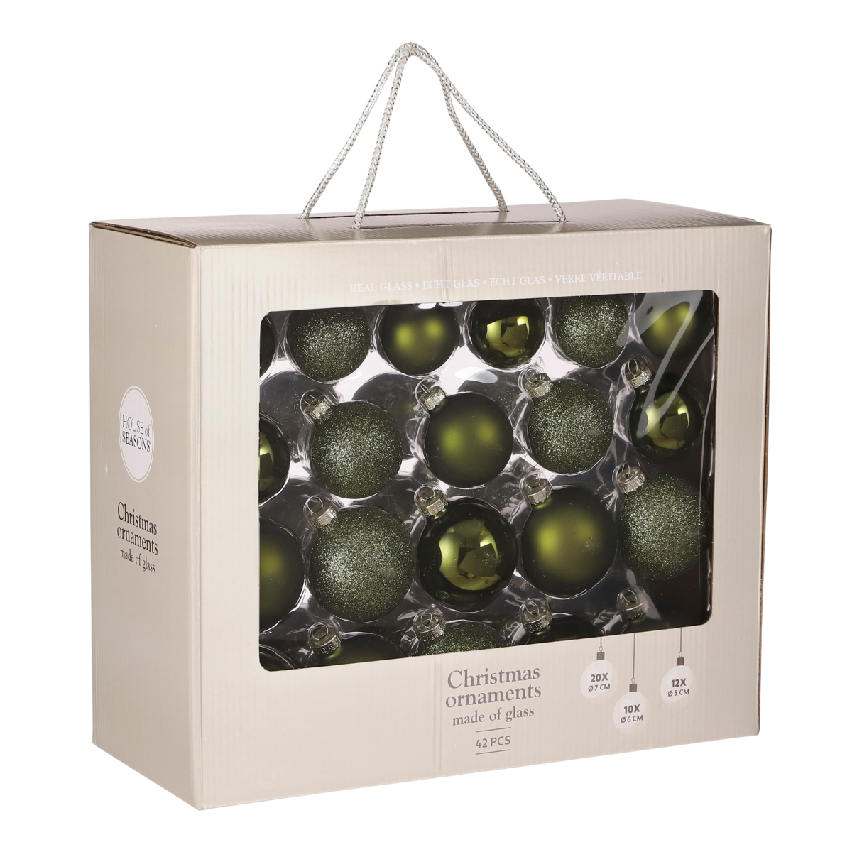 Mit diesen Weihnachtskugeln von House of Seasons macht das Schmücken Ihres Weihnachtsbaums noch mehr Spaß! Das Set besteht aus nicht weniger als 42 Teilen, sodass Sie sofort eine schöne Basis haben. Die Weihnachtskugeln sind aus Glas und haben eine dunkelgrüne Farbe. Sehr trendy und etwas anders als die traditionellen Farben. Es gibt eine matte, eine glänzende und eine glitzernde Variante in verschiedenen Größen. Es gibt 20 Weihnachtskugeln mit Ø7 cm, 12 mit Ø5 cm und 10 mit Ø6 cm. Schön kombinierbar mit anderem Christbaumschmuck aus der House of Seasons Kollektion!